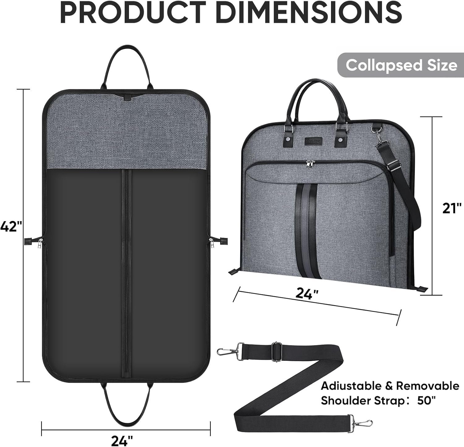 [Optimized Dimensions] The dimensions of the suit travel bags for men is 42”x24” when fully expanded, ensuring that your suits, dresses, and precious attire have ample space to rest without getting wrinkled. The dress garment bags for travel gracefully folds down to a compact 24”x21”, making storage or transit a breeze. The adjustable shoulder strap can be extended up to 50” to suit your carrying preference.