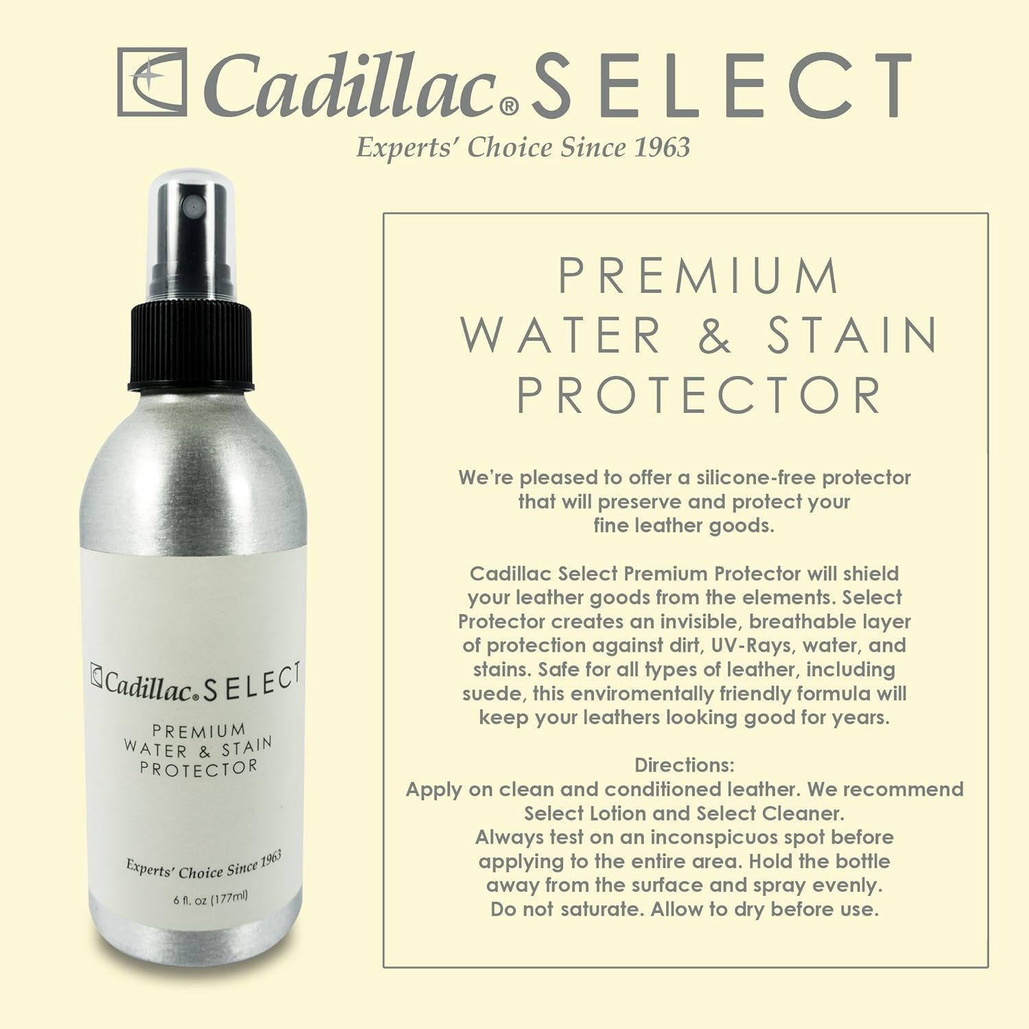 Cadillac Select Premium Protector will shield your leather goods from the elements. Select Protector creates an invisible, breathable layer of protection against dirt, UV-rays, water, and stains. Safe for all types of leather, including suede and nubuck, this premium protector will keep your leather looking good for years to come. Â