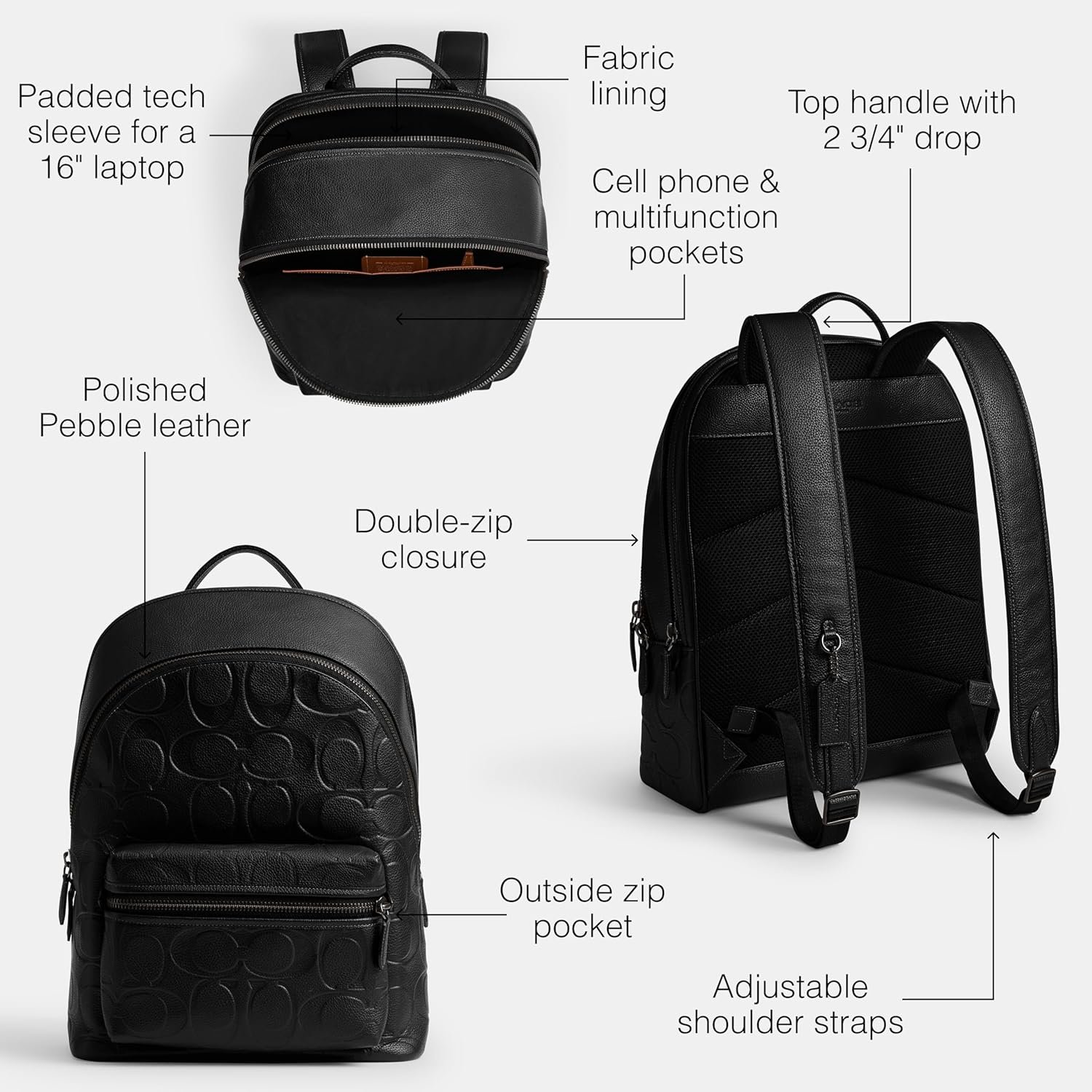 For adventures near and far, our Charter is designed to make every journey, commute and errand feel like a first-class experience. The Charter Backpack is an old-school silhouette crafted of soft polished pebble leather detailed with our maxi Signature print. Signature polished pebble leather, inside zip, cell phone and multifunction pockets, inside tech sleeve, double zip closure, fabric lining, top handle with 2 3/4″ drop, outside zip pocket, adjustable shoulder straps, fits a 16″ laptop, 11 3/4″ (L) x 15 3/4″ (H) x 5 3/4″ (W)