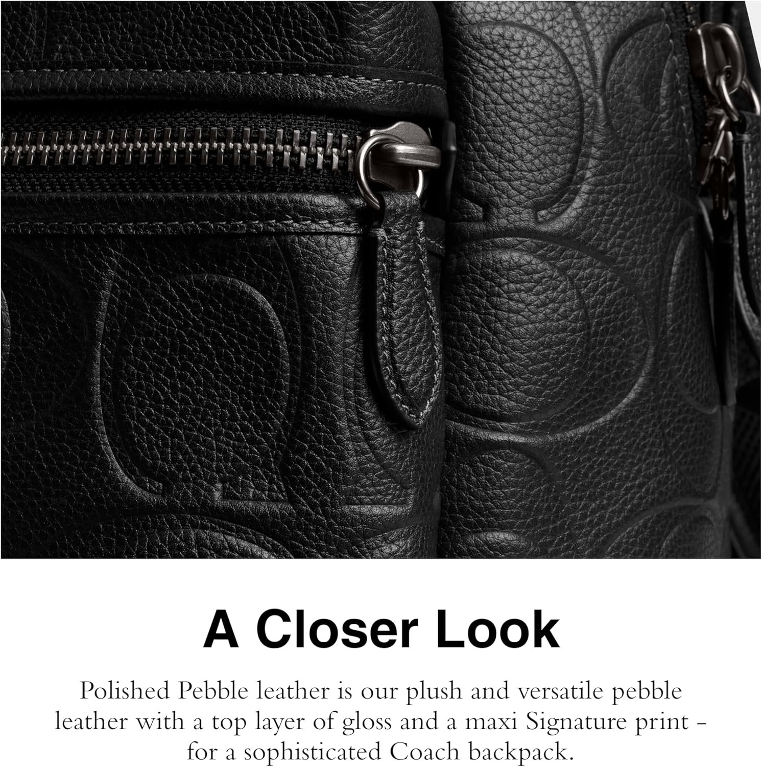 Signature Polished Pebble Leather: Polished Pebble Leather is our plush and versatile pebble leather with a top layer of gloss and a maxi Signature print – for a sophisticated Coach backpack