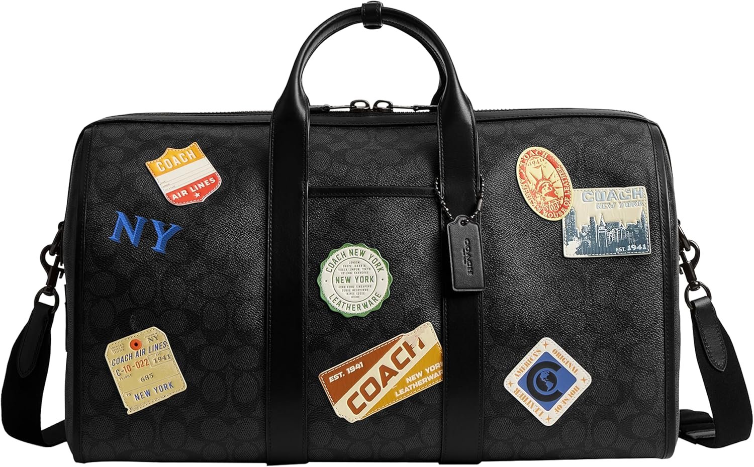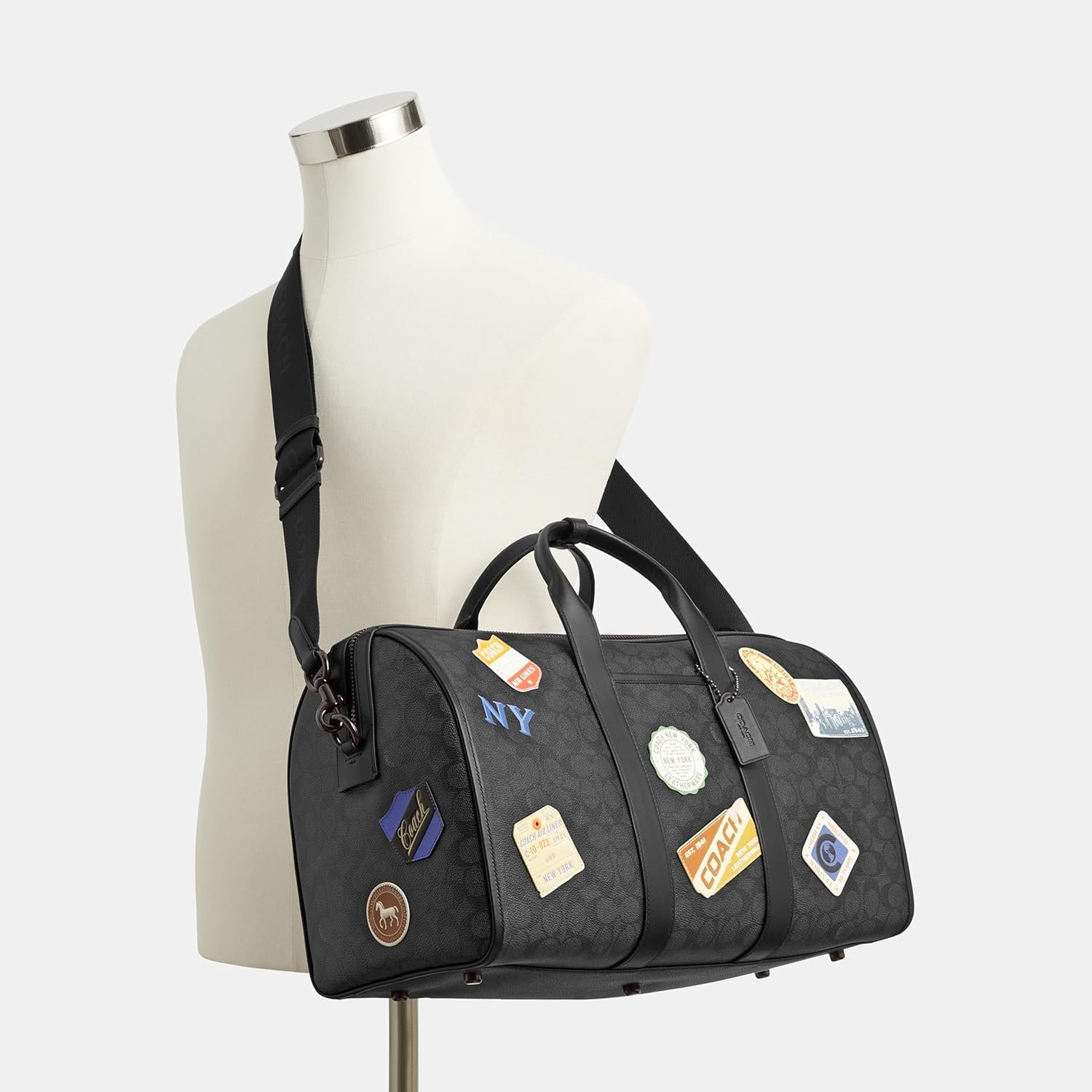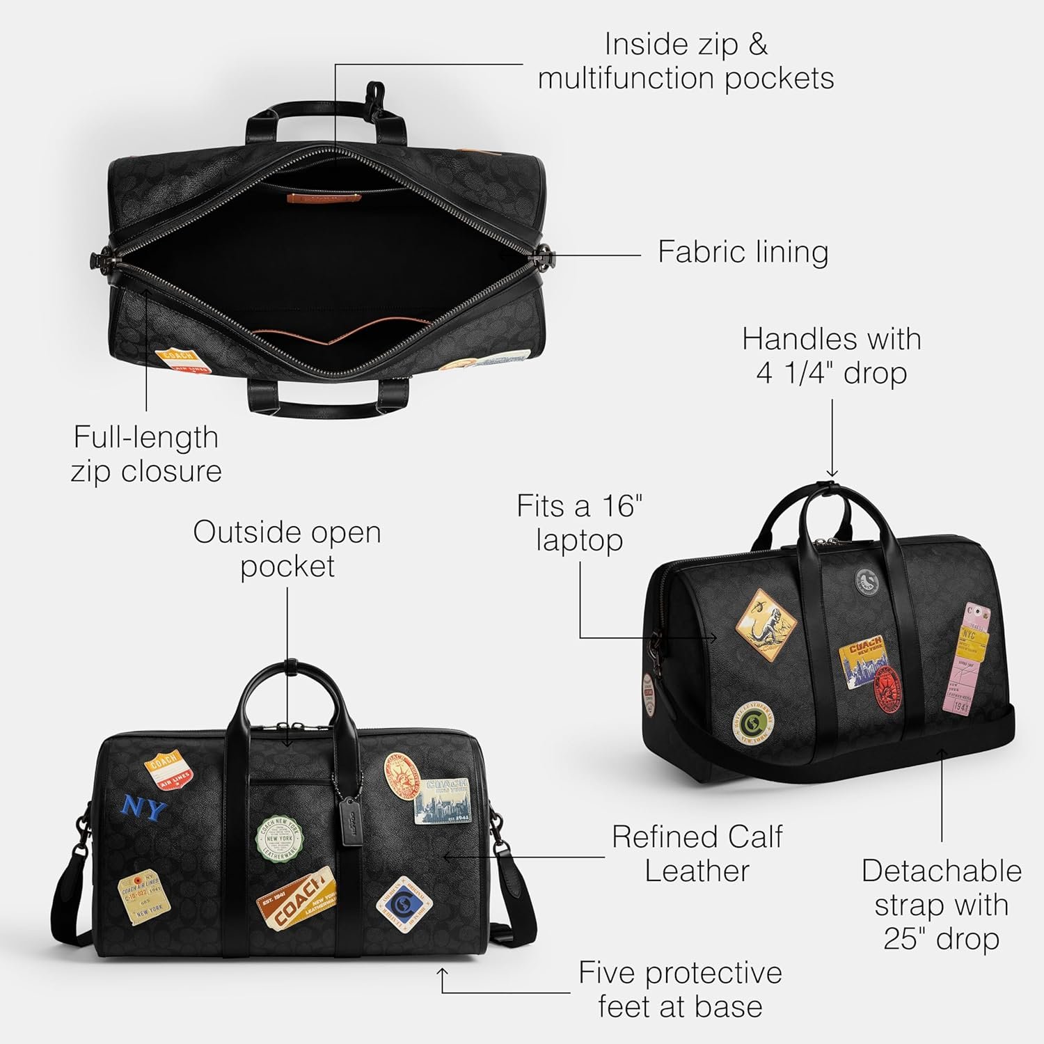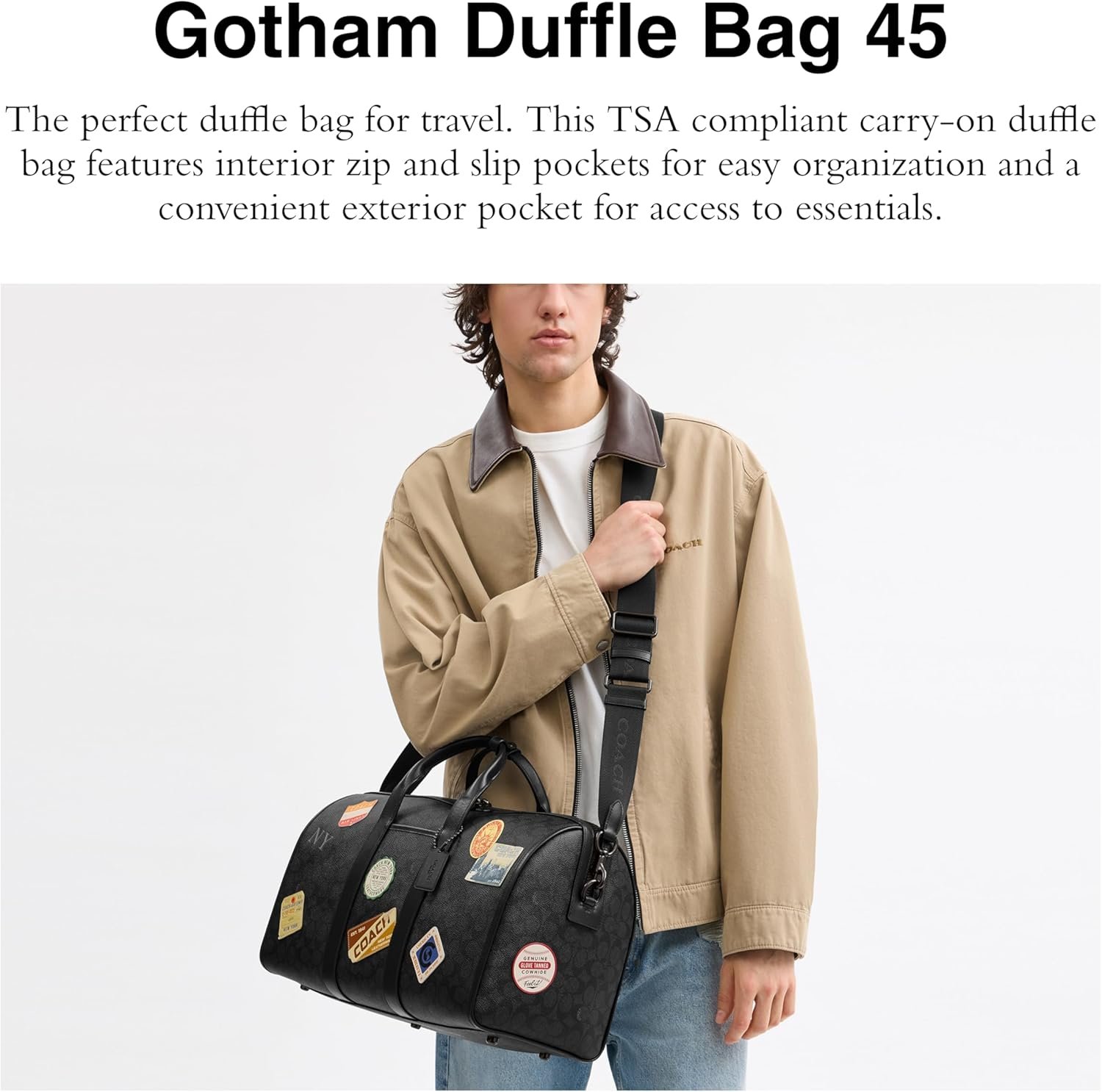A bag as distinct as its namesake city, the Gotham is a sleek, streamlined travel duffle. This no-fuss, generously-sized carry-on bag is secured by a zip closure and finished with a detachable strap for shoulder or crossbody wear. Signature coated canvas, refined calf leather and smooth leather, inside zip and multifunction pockets, full-length zip closure, fabric lining, handles with 4 1/4″ drop, outside open pocket, detachable strap with 25″ drop for shoulder or crossbody wear, five protective feet at base, fits a 16″ laptop, 17 3/4″ (L) x 10″ (H) x 7 3/4″ (W), complies with TSA size regulations for carry-on luggage