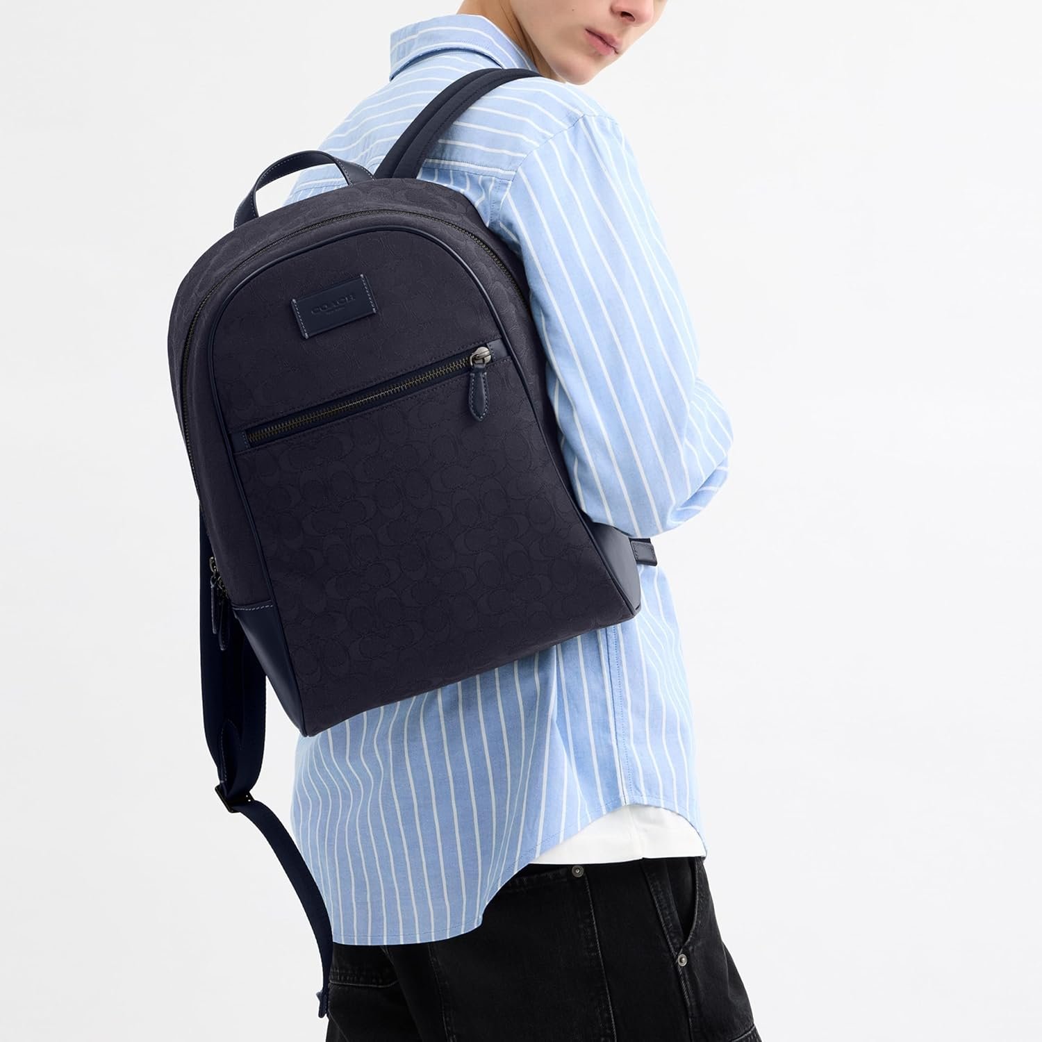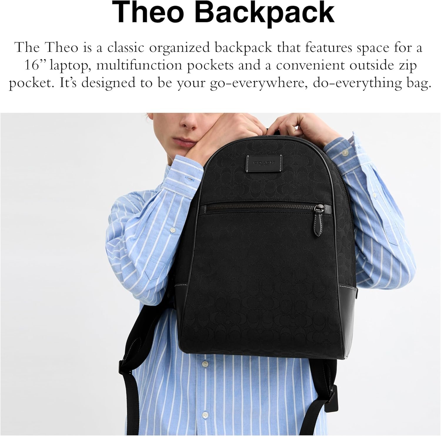 Store smart and style smarter with the COACH Theo Backpack In Signature Jacquard. Crafted from leather, this bag features zippered closure, two adjustable shoulder straps, one top carry handle, one interior zippered pocket, one cell phone pocket and