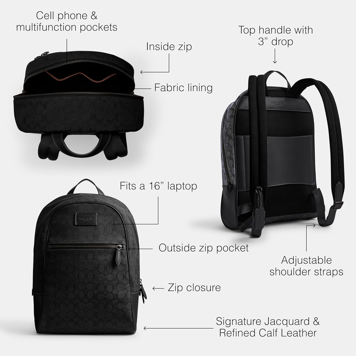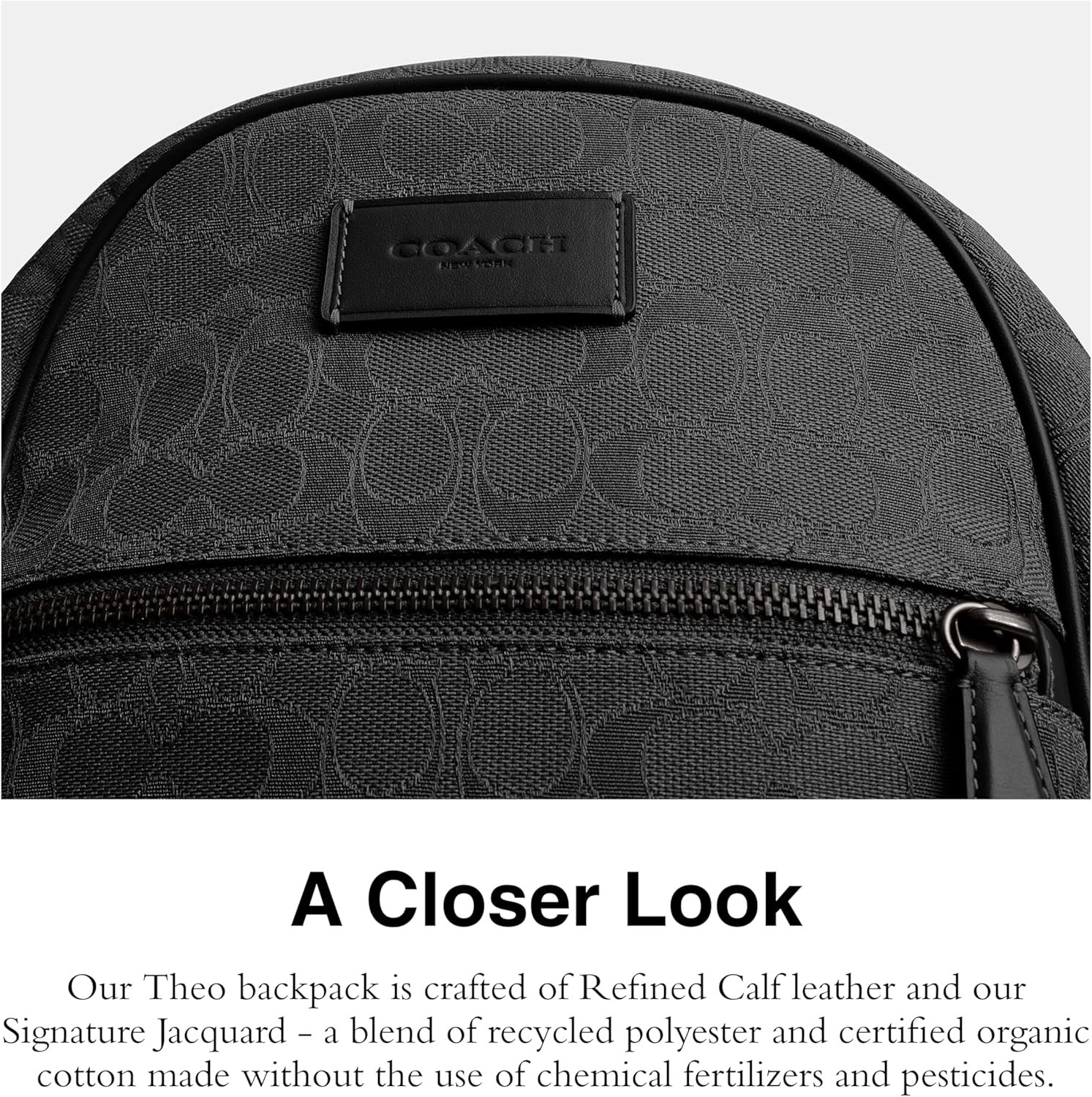 Store smart and style smarter with the COACH Theo Backpack In Signature Jacquard. Crafted from leather, this bag features zippered closure, two adjustable shoulder straps, one top carry handle, one interior zippered pocket, one cell phone pocket and multifunction pockets. Fabric lining.