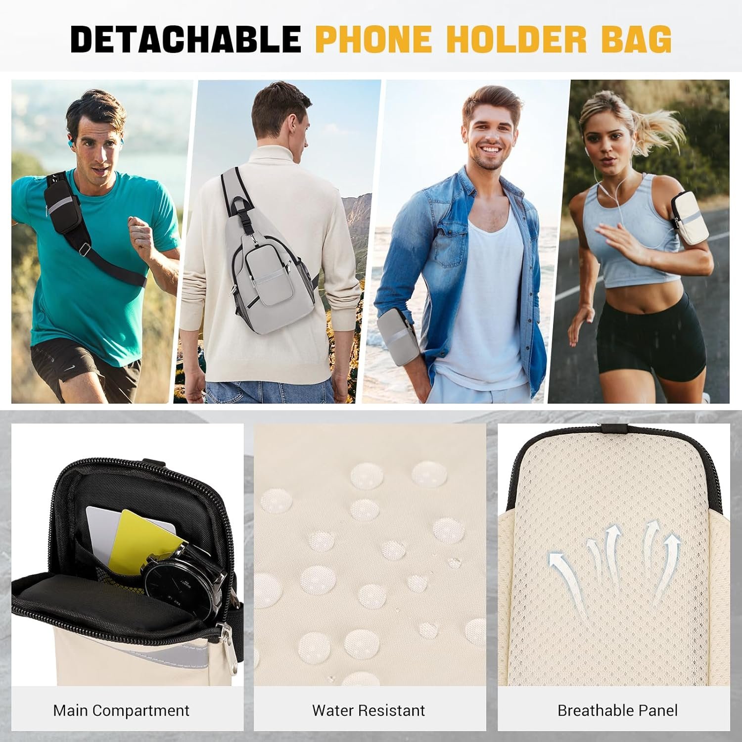 Detachable Phone Holder Bag: the convertible sling backpack offers versaile carry style and convenicnce. Unlike the others fixed on the strap, ours could avoid chafing the neck efficiently. It also could be worn on the wrist or shoulder while exercising