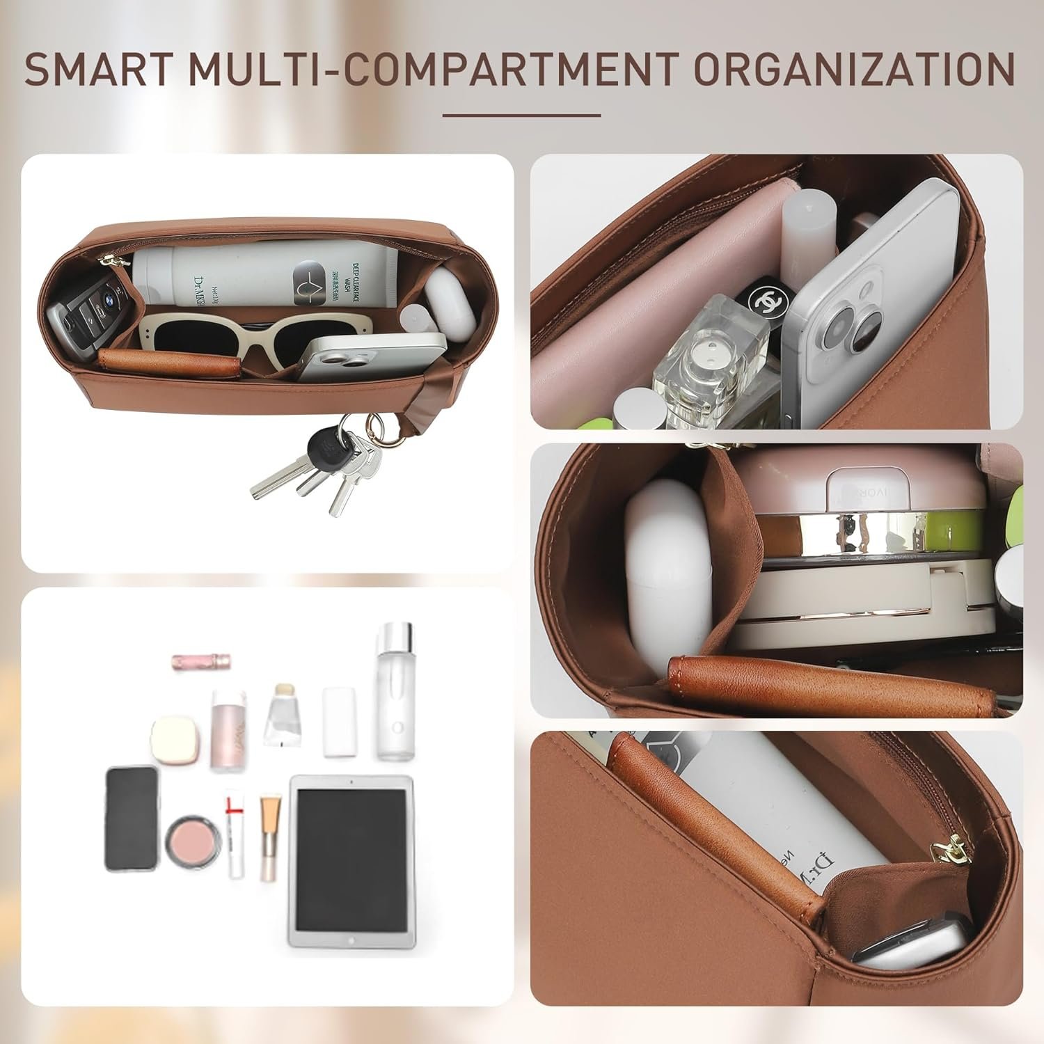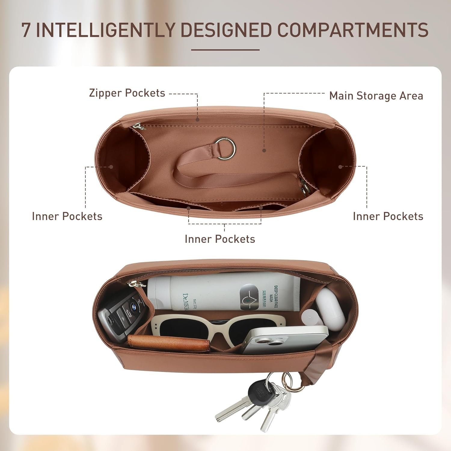 Smart Storage System‌: Includes 6 functional compartments (5 open + 1 zippered) to separate items like phones, wallets, and makeup. Innovative keychain design with anti-lost features—never misplace your keys again. The bag organizer insert’s expandable design accommodates varying loads without bulging.