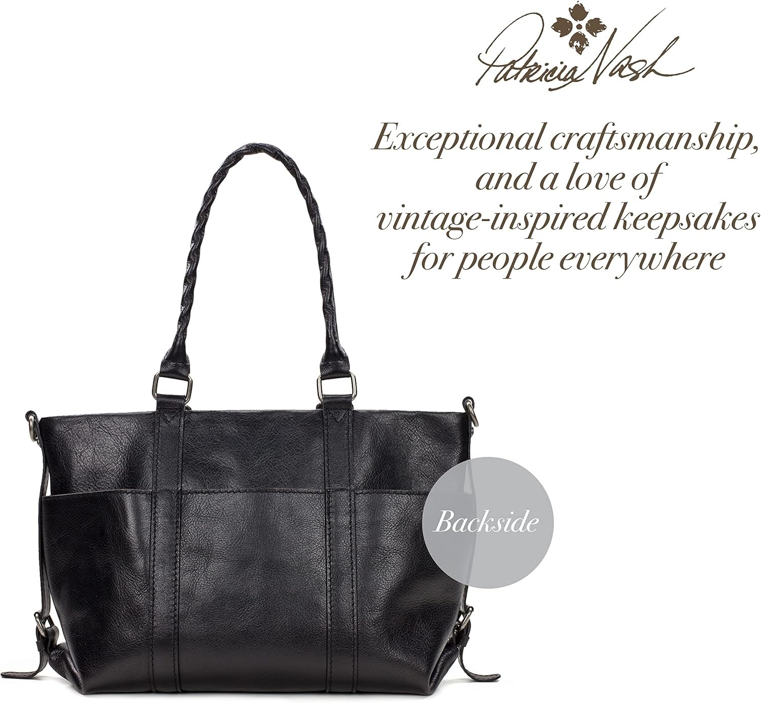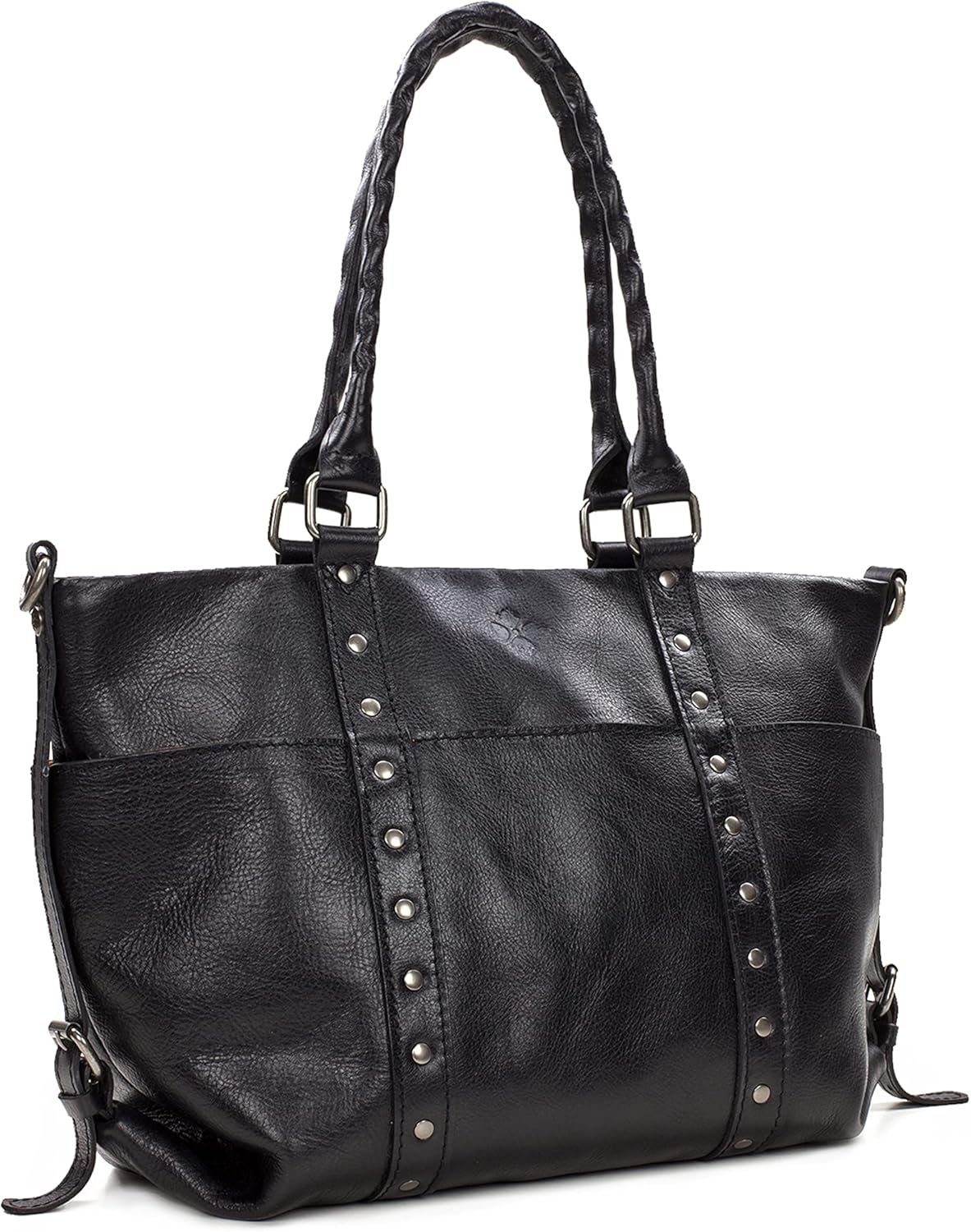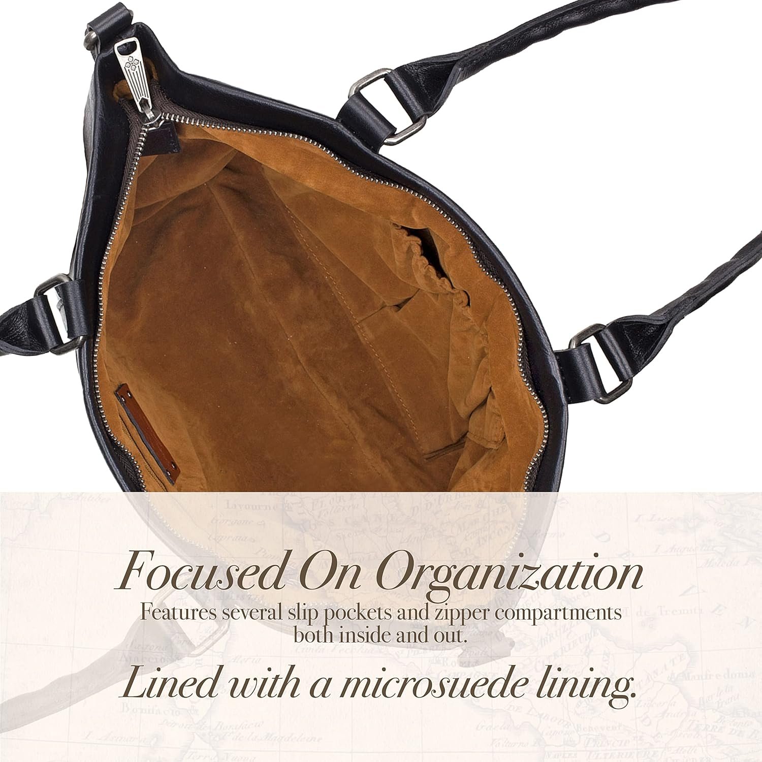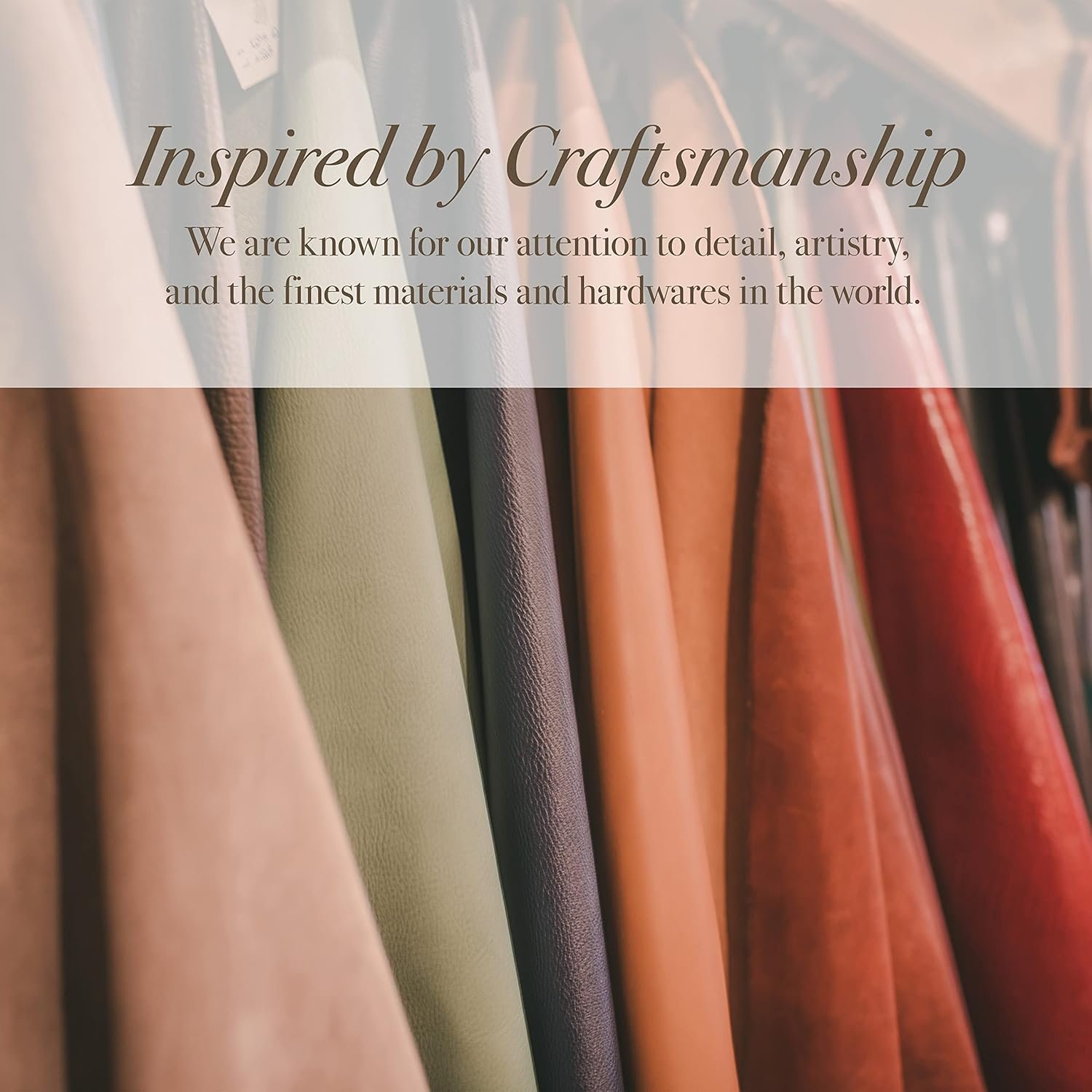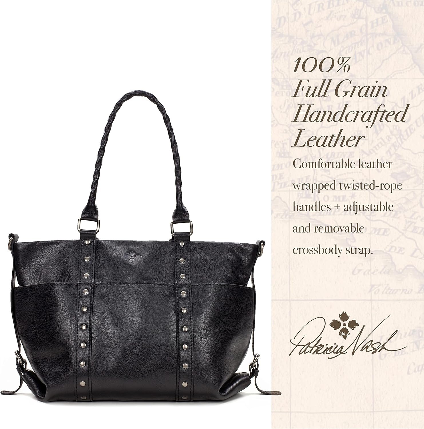 Become the object of envy with the Carducci. Crafted from supple leather and embellished with antique studs bearing our signature grape leaf logo, this top-zip tote features twisted leather handles, an adjustable/detachable strap, and side-cinching buckle detailing. 100% full-grain leather Interior: 1 zip pocket, 2 slip pockets; faux suede lining, 100% polyester Exterior: 3 front slip pockets, 3 rear slip pockets, deep embossed grape leaf logo, burned edge finish Zipper closure Signature brushed metal hardware, heavy handcrafted stitching Dimensions: 15″(W) x 10 1/2″(H) x 6 1/2″(D) Strap drop: 21″ – 25″ Handle drop: 10″