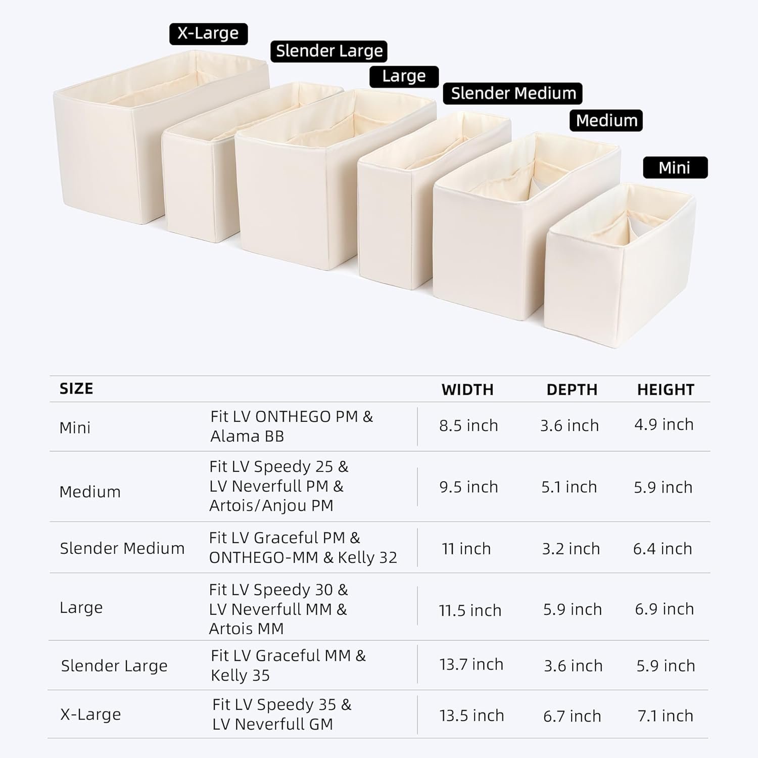 Six sizes to fit most elegant handbags—one organizer for multiple bags.Change your purse in a second without rearranging the stuffs of your purse, allowing you go out early in the busy morning. Mini:8.5 x 3.6 x 4.9、Medium(M):9.5 x 5.1 x 5.9、Slender Medium(SM):11 x 3.2 x 6.4、Large(L):11.5 x 5.9 x 6.9 、Slender Large(SL):13.7 x 3.6 x 5.9、X-Large(XL):13.5 x 6.7 x 7.22.Unit:inch.