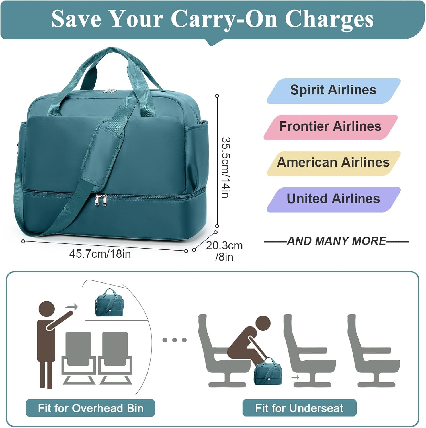 Meet the Standards for Air Travel: The travel bag size design of 18 x 14 x 8 inches meets the personal item size requirements of Spirit Airlines & Frontier, which can fit in the overhead compartment in flight,or under the seat during the flight. Using this personal item travel bag can save your carry-on charges
