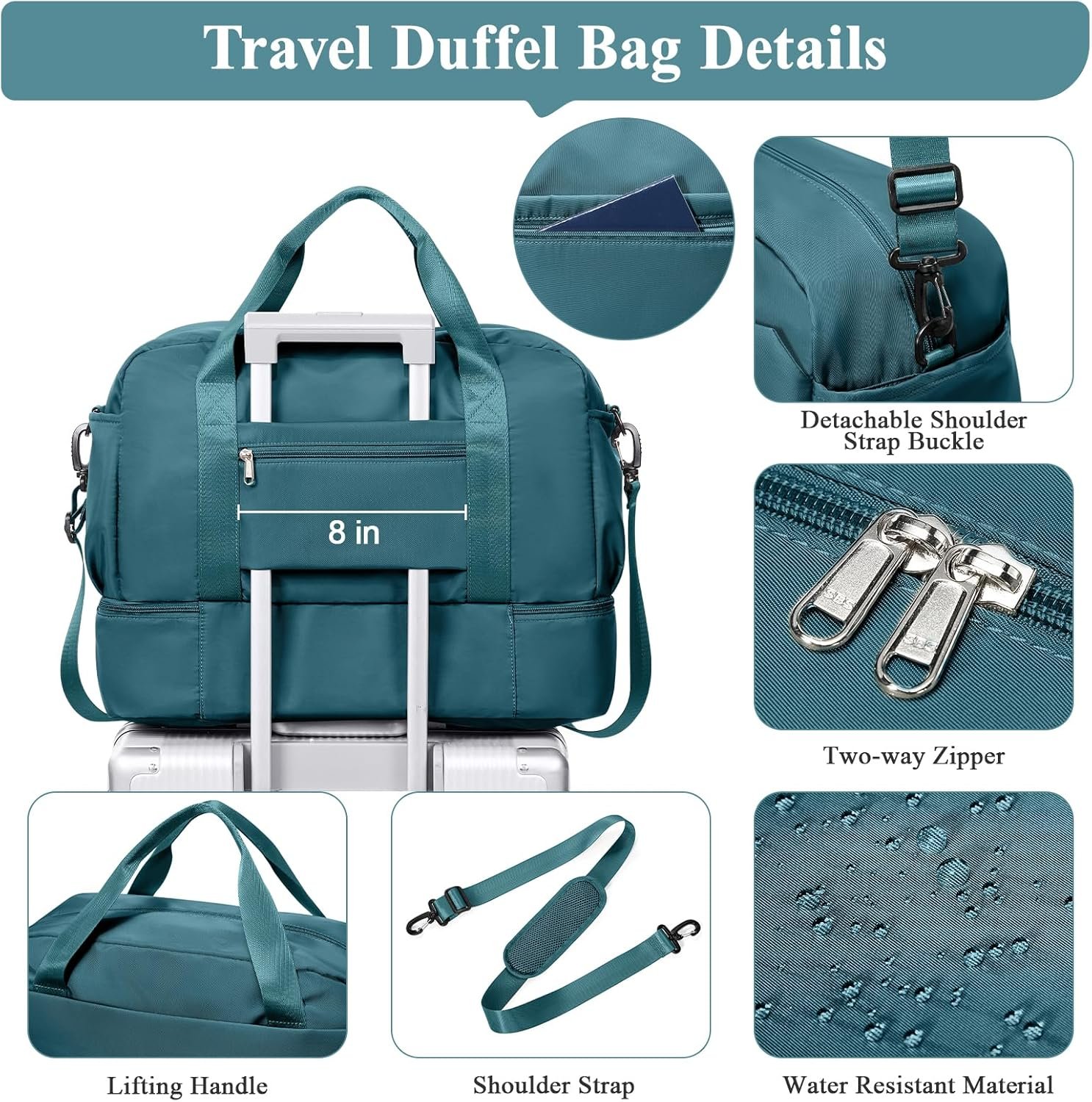 Multiple Pockets of Varying Sizes:The travel duffel bag has a total of 9 pockets, 4 inner pockets—1 zipper main pocket, 1 zipper wet pocket, 2 insert pockets;and 5 outer zipper pockets—2 side pockets,1 front pocket, 1 back pocket, 1 pocket on bottom fit shoes perfectly. Its pocket configuration can fully meet and optimize the packing needs for a 3-5 day trip