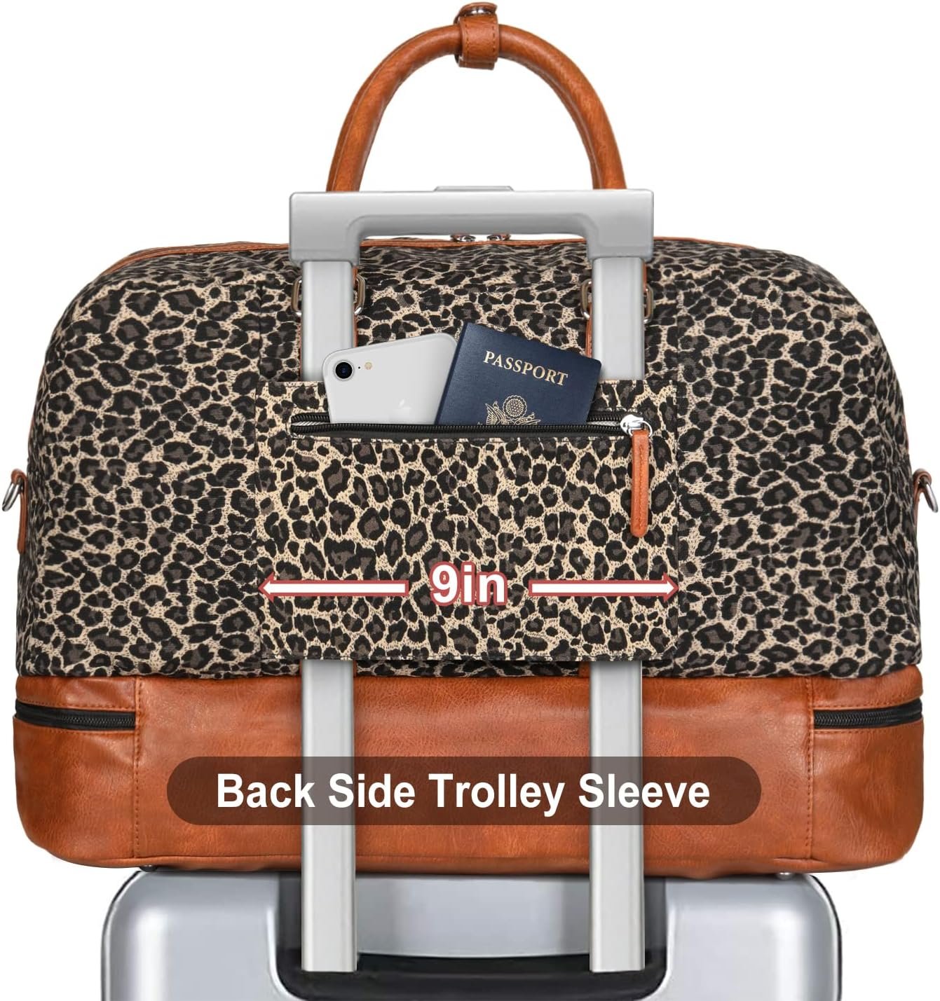 Sleeve on the back of the weekender bag can be attached to the luggage handle for easier carrying; The zipper pocket on the back sleeve is designed to keep your smartphone, ID card or passport inside for easy access;