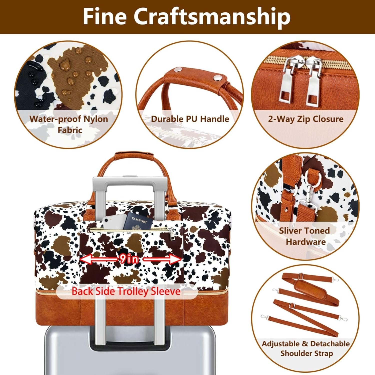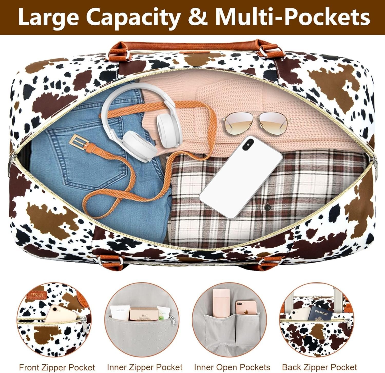 The interior of the womens travel bag is spacious and well-organized, with multiple compartments and pockets that allow you to store your belongings in a neat and orderly manner. The main compartment is roomy enough to hold all your clothing and toiletries, while the smaller pockets are perfect for storing items like your phone, wallet, and passport. The travel tote bag also features a separate shoe compartment that keeps your shoes away from your clothes, ensuring that everything stays clean and tidy.